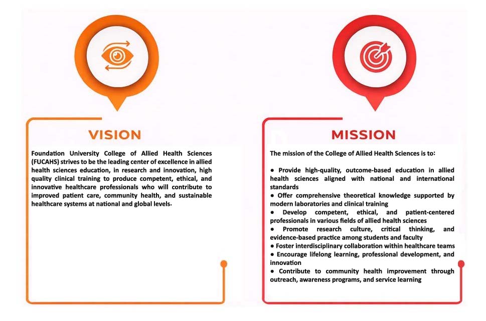 Committed to national and international academic standards, Foundation University College of Allied Health Sciences aims to produce skilled, knowledgeable, and compassionate healthcare professionals capable of contributing effectively to patient care, public health, and the healthcare system of Pakistan and beyond.